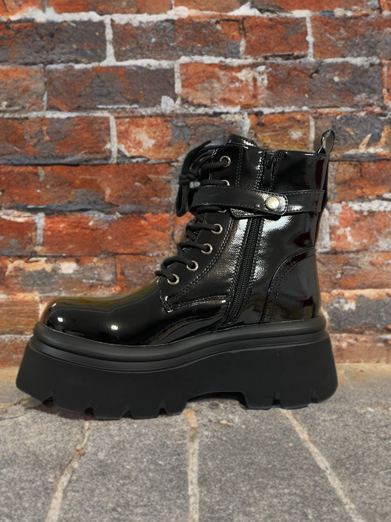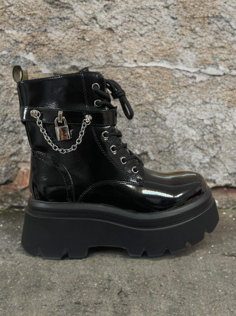 Estos botines de charol negro combinan estilo y funcionalidad. Con cordones y un broche superior, ofrecen un ajuste seguro y cómodo. Además, cuentan con cierre lateral para facilitar su uso, mientras que detalles como una cadena y un pequeño candado aportan un toque único y sofisticado a tu look. Perfectos para destacar con elegancia en cualquier ocasión.