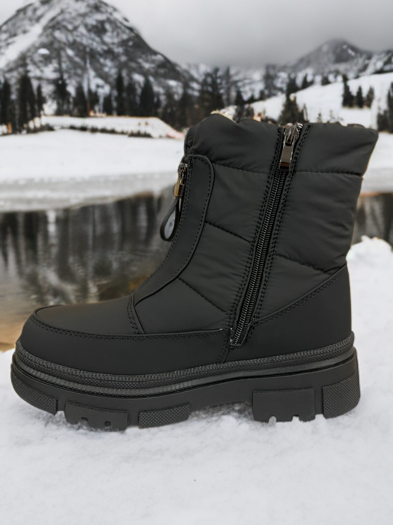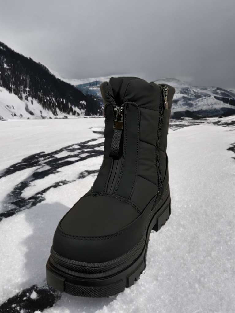 Luce con estilo y comodidad este invierno con nuestro botín negro de temporada, diseñado especialmente para adultos que valoran la funcionalidad sin perder elegancia. Este modelo cuenta con un doble cierre innovador: uno lateral para facilitar el calce diario y otro frontal tipo cremallera decorativa, que aporta un toque moderno y distintivo.