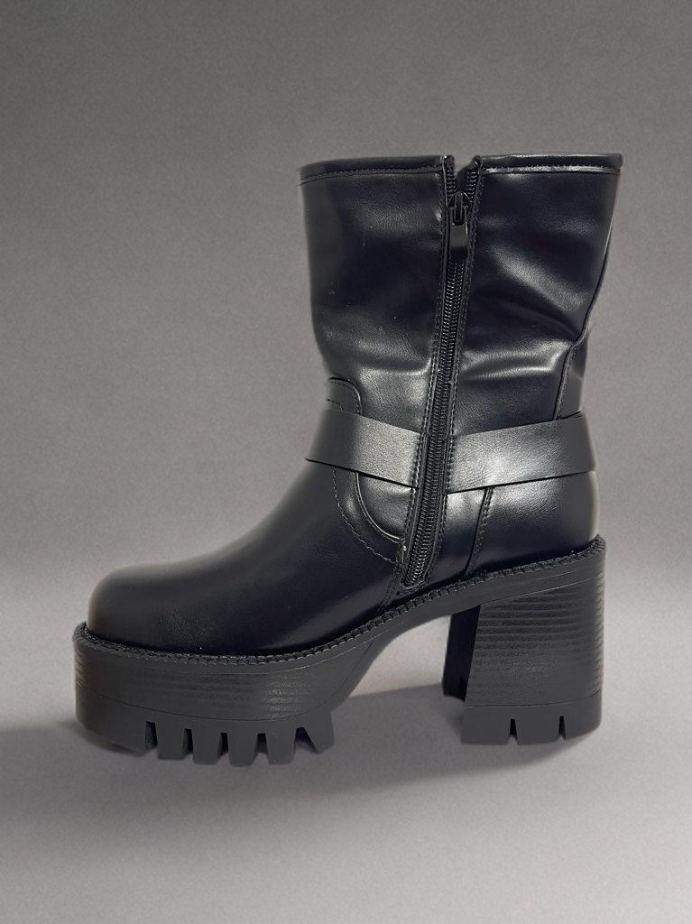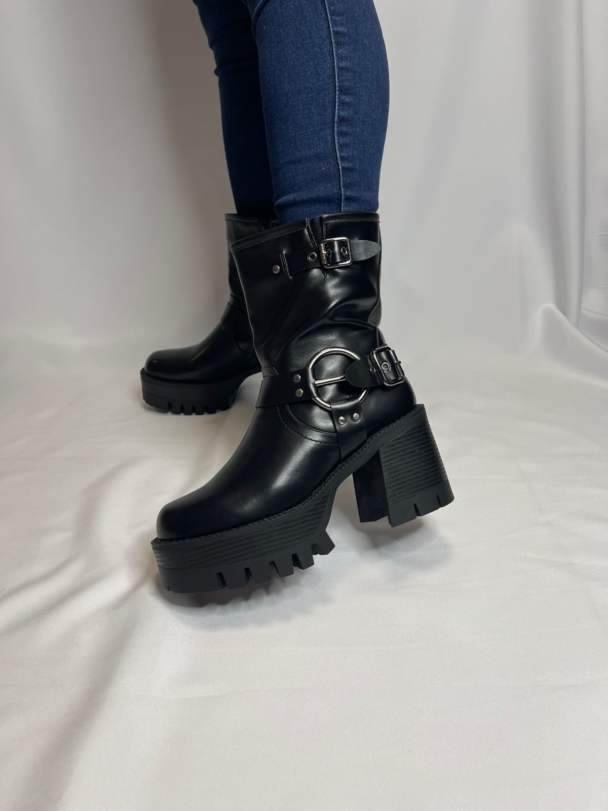 Estos botines negros de taco medio combinan estilo y comodidad. Su broche en la parte superior asegura un ajuste perfecto, mientras que el cierre lateral facilita su uso. El detalle único en la parte baja añade un toque especial que realza cualquier look. Perfectos para quienes buscan elegancia y funcionalidad en un solo calzado.
