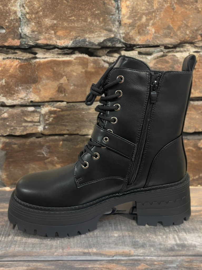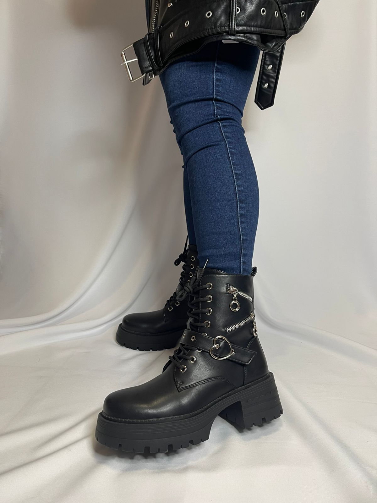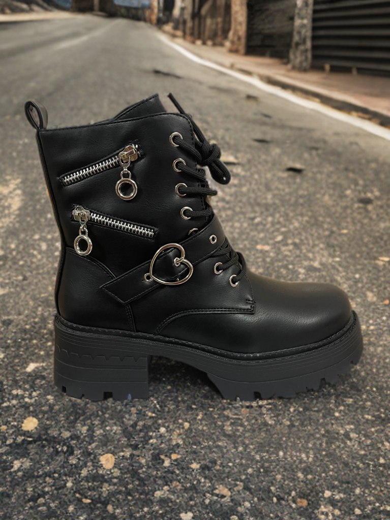 Dale a tu look un toque fresco y atrevido con este bototo de eco cuero en color negro. Cuenta con cordones clásicos para un ajuste seguro, complementados con pequeños cierres laterales que facilitan el calce y añaden un detalle moderno.